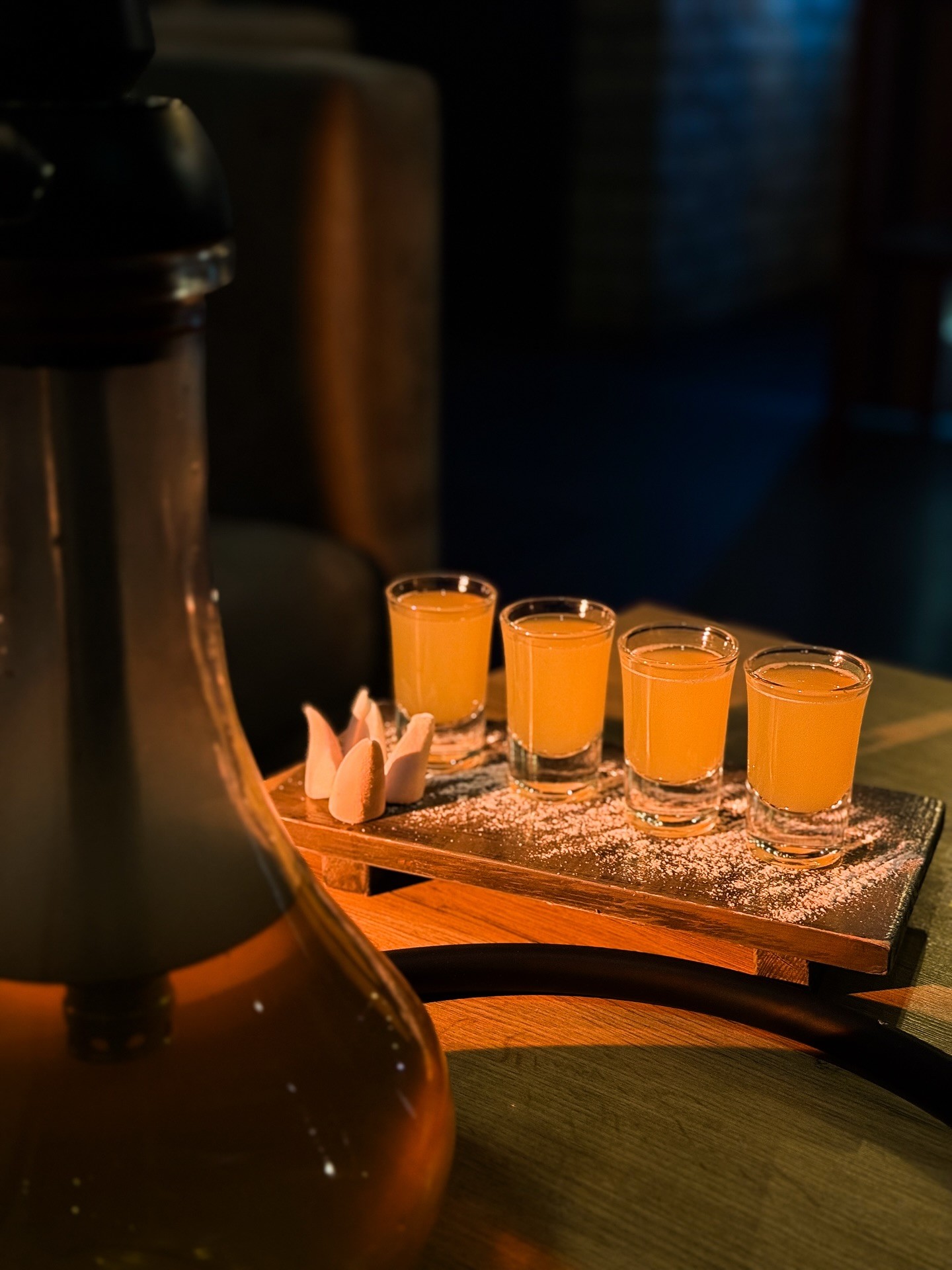 Меню заведения — кальяны, коктейли, чайная карта, кофе, закуски, доставка пиццы, а также алкогольные и безалкогольные напитки.